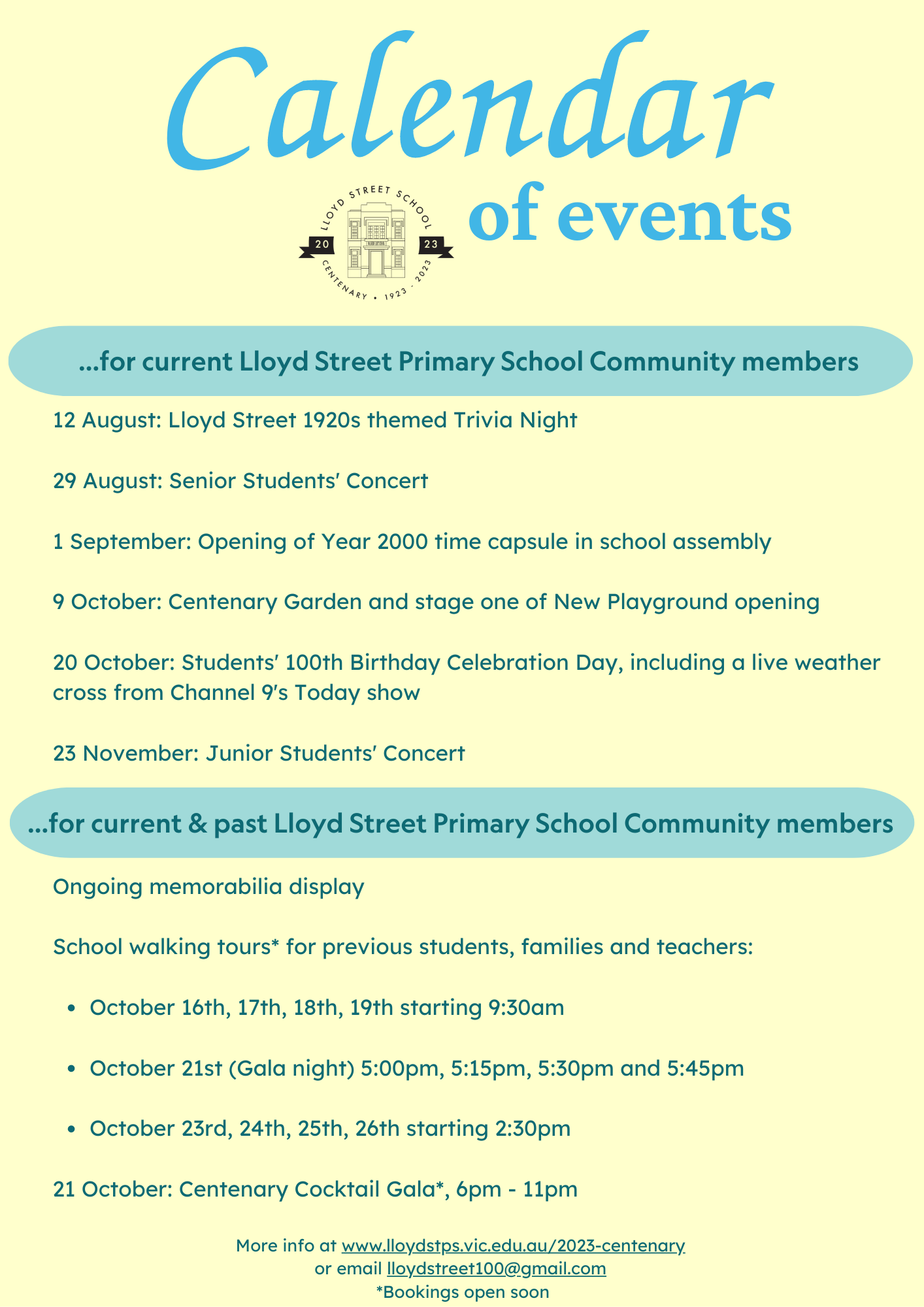It's the 100th birthday celebrations at Lloyd Street School. These will mostly be occurring in terms 3 and 4 with special events for current students, tours and displays for past students and community events as well.