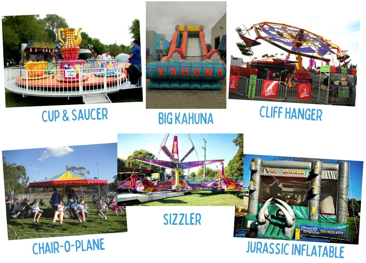 Rides, Rides, and more Rides! 6 fun rides for all ages Lucky Dip Face Painting Creative Corner Teacher Dunk Tank Chocolate Throw Kids Glow Up Showbags |